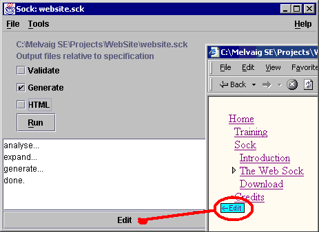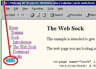 The body of each page is embedded in w:page tags, which are themselves nested to reflect the structure of the web site. It is this structure which is used to generate the menu tree you see on the left. There are advantages to writing this way rather than use a wysiwyg editor: you are encouraged to concentrate on content rather than presentation, so you get for free the alternate text only format for the site (or any other format you care to invent). There are disadvantages too, one being how do you find your way from the rendition of a page in the web browser to the original source code? Sock has an answer to that one. In development mode we set a flag which adds a small 'edit' icon to the rendered HTML: